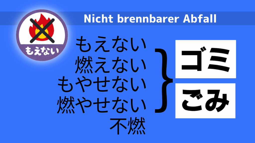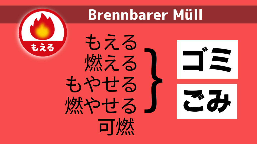Müll wird oft in „brennbaren Müll“, „nicht brennbaren Müll“ und „Plastik“ unterteilt.
