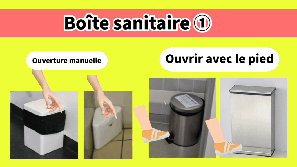 Toutes les toilettes pour femmes sont équipées de bacs sanitaires. Ils sont généralement placés dans un coin de la cabine. Il existe des modèles simples et compacts en plastique, des modèles de taille moyenne dont le couvercle s’ouvre en marchant dessus, et des modèles automatiques dont l’ouverture se fait en passant la main au-dessus d’un capteur. Enveloppez les déchets dans un petit récipient et jetez-les dans le bac sanitaire prévu à cet effet. Les modèles automatiques sont très pratiques, car ils permettent de les jeter sans même toucher le bac.