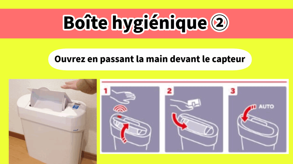 Cependant, ne jetez rien dans les toilettes. Si vous jetez des produits d’hygiène ou du papier toilette ordinaire dans les toilettes, cela les détruira. Ne jetez que le papier toilette fourni.
