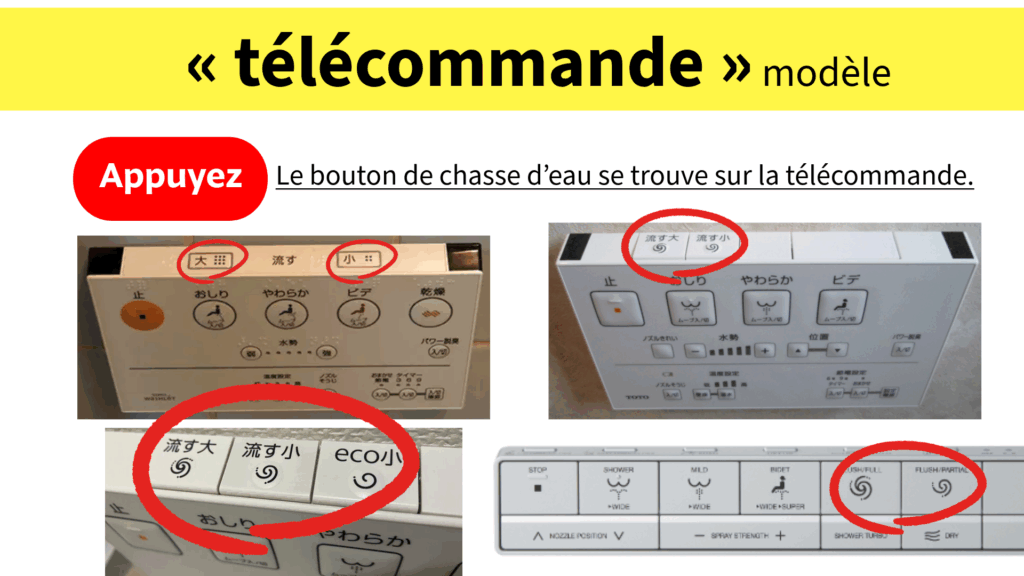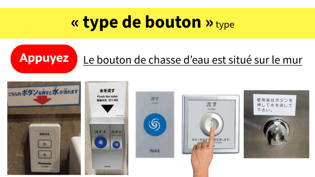 Il existe différentes manières d’écrire le « bouton de chasse d’eau » en japonais. Assurez-vous donc de mémoriser les caractères les plus courants. Les toilettes japonaises possèdent de nombreux boutons et l’écriture est souvent exclusivement en japonais. Les connaître vous évitera donc de paniquer.