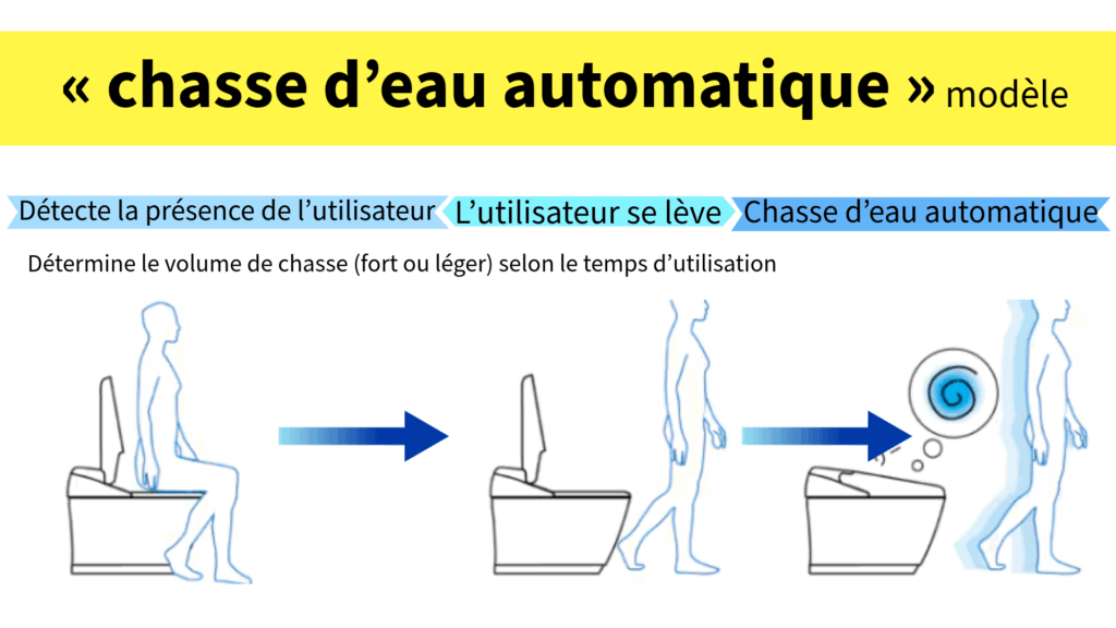 Dès que l’on se lève des toilettes, la chasse d’eau se déclenche automatiquement. De nombreux touristes sont impressionnés par cette fonctionnalité, car il n’est pas nécessaire de l’actionner soi-même. J’ai été vraiment impressionné la première fois que je l’ai essayée.