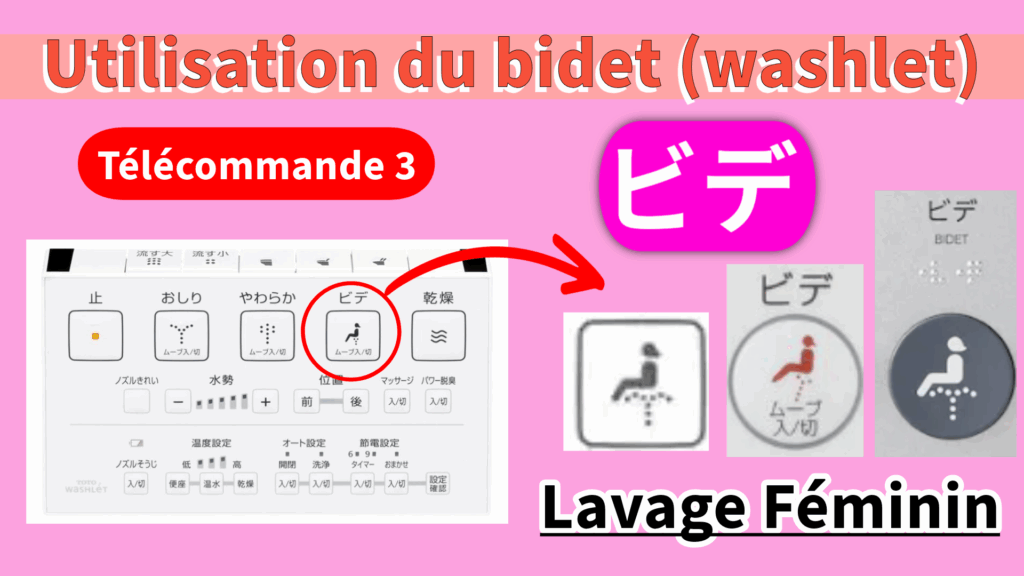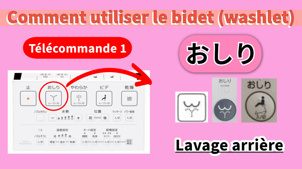 C’est le bouton le plus courant pour se laver les fesses. Lorsque vous appuyez dessus, la buse sort automatiquement et l’eau s’écoule. Veillez à ne pas vous lever après avoir appuyé sur le bouton. De plus, comme je l’expliquerai plus tard, vous pouvez régler la pression de l’eau. Assurez-vous donc qu’elle n’est pas réglée au maximum avant d’appuyer sur le bouton. Le réglage le plus fort est assez puissant, vous pourriez donc être surpris. Je préfère le réglage le plus faible 💗