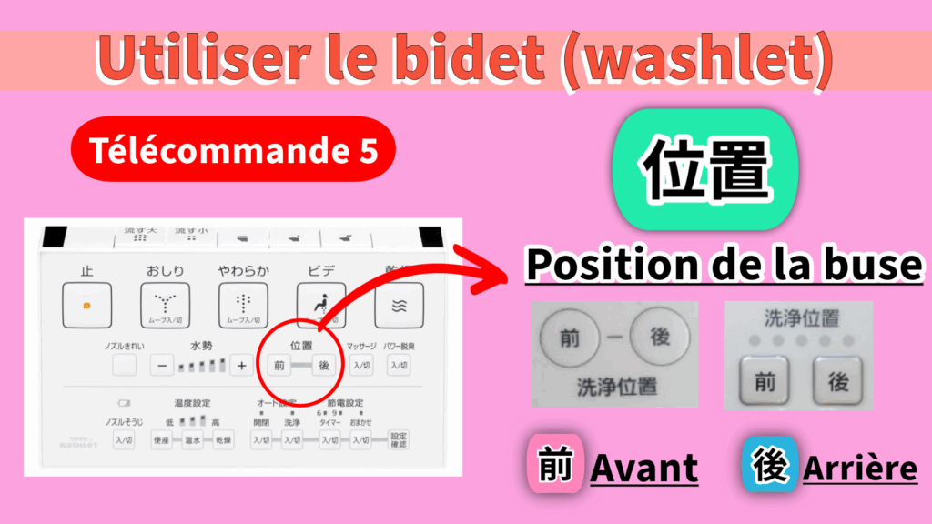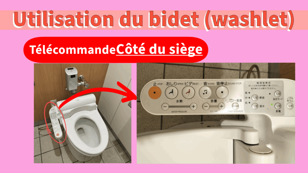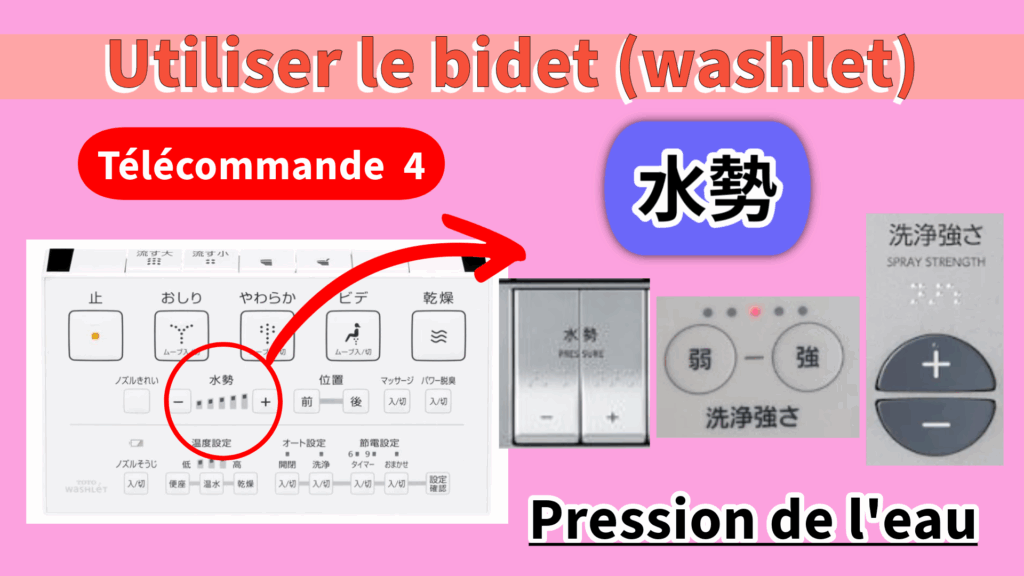 Voici les boutons permettant de régler la pression de l’eau du « bas » et du « bidet ». L’utilisateur précédent a peut-être réglé le réglage le plus fort ; il est donc conseillé de vérifier d’abord quel est le réglage ! Le réglage le plus fort peut être douloureux !