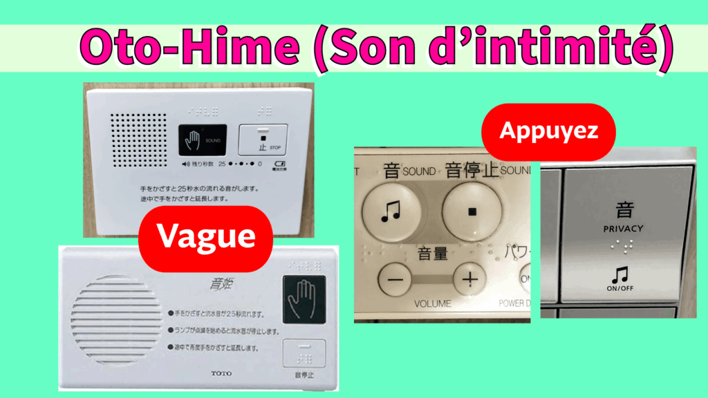 Il existe différents types d’Otohime, comme un système à bouton, un système où l’on passe la main devant un capteur et un système qui émet automatiquement un son dès l’entrée dans la cabine. De plus, même si vous ne le trouvez pas sur la télécommande murale, il peut être caché sur le panneau latéral de l’abattant ; alors, n’abandonnez pas et continuez à chercher.