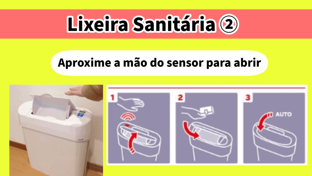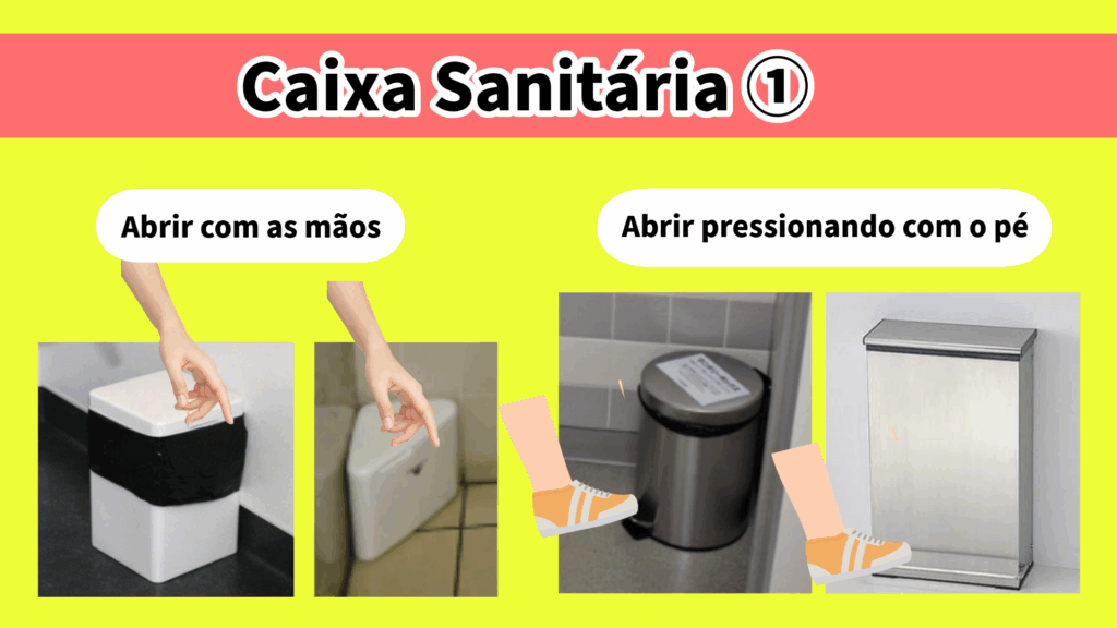 Todos os banheiros femininos são equipados com caixas sanitárias. Elas geralmente ficam no canto da cabine. Existem modelos pequenos e simples, feitos de plástico, modelos médios que abrem a tampa ao pisar neles e modelos automáticos que abrem a tampa ao colocar a mão sobre um sensor. Embrulhe os dejetos em um pequeno recipiente e jogue-os na caixa sanitária apropriada. Os modelos automáticos são muito práticos, pois você pode jogá-los fora sem precisar tocar na caixa.