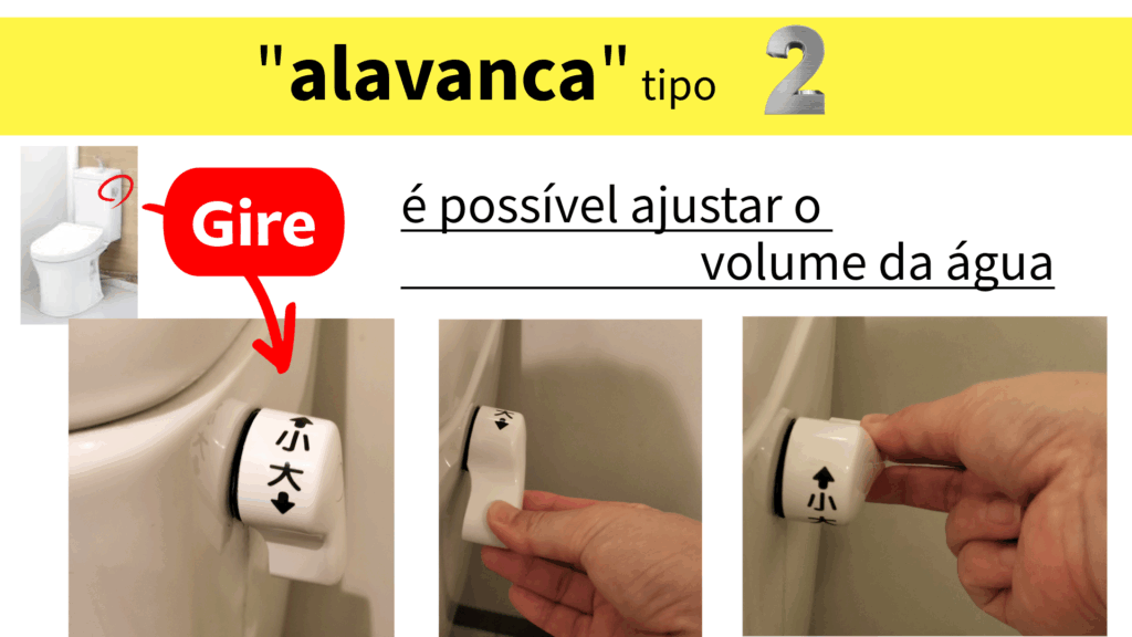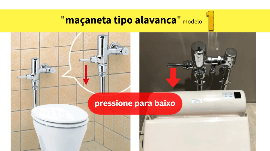 Embora este seja um tipo antigo, na verdade existem dois tipos. Um é uma alavanca em forma de haste que se projeta dos canos do vaso sanitário; você dá descarga pressionando-a para baixo. Ela pode estar escondida atrás da tampa do assento do vaso sanitário, então, se você não conseguir encontrá-la, tente procurar atrás dela. O outro tipo é uma pequena alavanca que você gira na lateral ou na frente da caixa d’água. Este tipo às vezes é rotulado como “grande” ou “pequeno” e permite ajustar a quantidade de água dependendo da situação. Esta é outra expressão de uma cultura que valoriza os recursos.