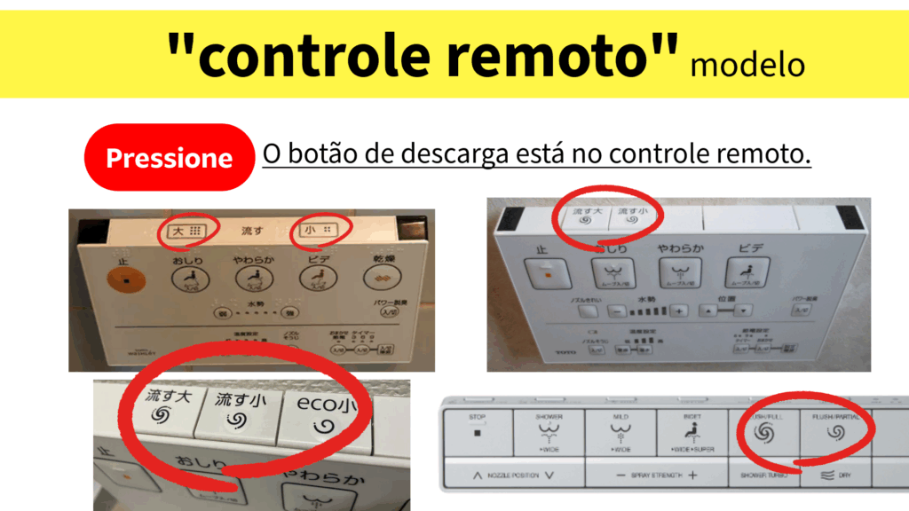 Este tipo possui um botão de descarga no controle remoto de parede. Com tantos botões, incluindo a função bidê, pode ser difícil identificar qual é o botão de descarga. O botão de descarga geralmente está localizado na parte superior do controle remoto. Este tipo também pode ter botões para ajuste fino do volume de água, como “grande”, “pequeno” e “eco-pequeno”.