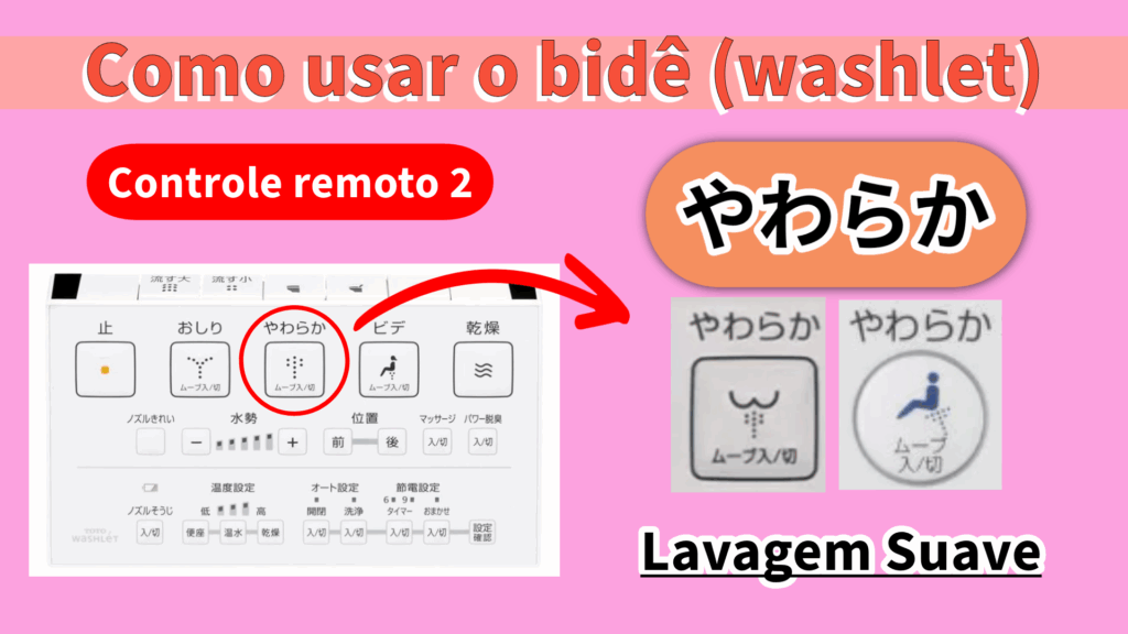 Alguns modelos têm esse botão, enquanto outros não, mas se tiver, ele limpará seu bumbum com uma pressão de água mais suave do que uma lavagem de bumbum comum. Isso é recomendado para pessoas com pele sensível. Além disso, mesmo que não haja um botão “suave”, alguns modelos alternam para o “modo suave” pressionando o botão “inferior” duas vezes.
