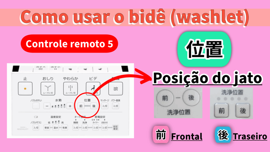 Estes são os botões para ajustar a pressão da água do “fundo” e do “bidê”. O usuário anterior pode ter ajustado para a configuração mais forte, então é uma boa ideia verificar primeiro qual é a configuração! A configuração mais forte pode ser dolorosa!