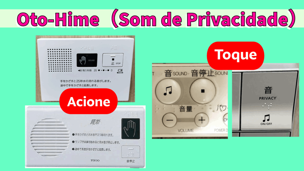 Existem vários tipos de Otohime, como um sistema operado por botão, um sistema em que você passa a mão sobre um sensor e um sistema que emite um som automaticamente ao entrar no box. Além disso, mesmo que você não consiga encontrá-lo no controle remoto na parede, ele pode estar escondido na lateral do assento do vaso sanitário, então não desista e continue procurando.